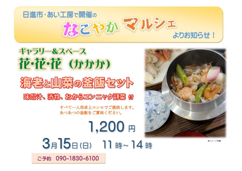 今月のランチは、「花・花・花」の海老釜飯セットです。